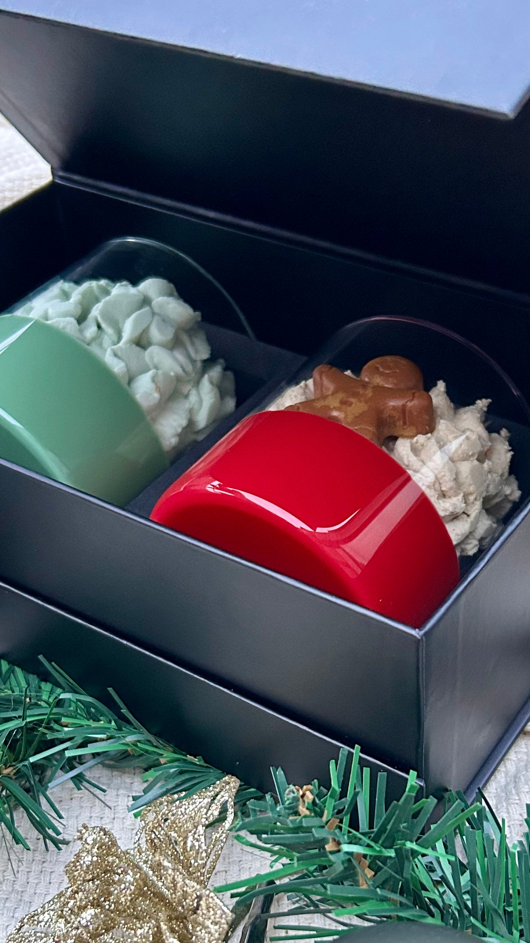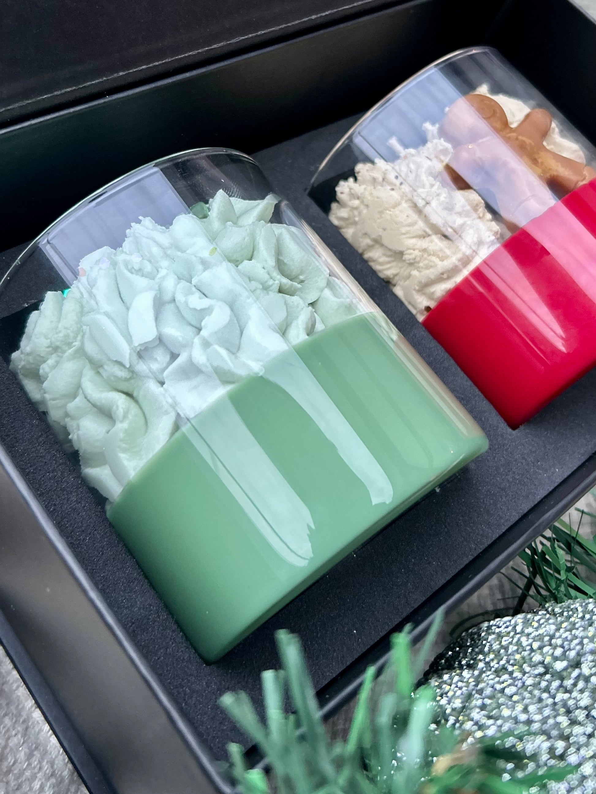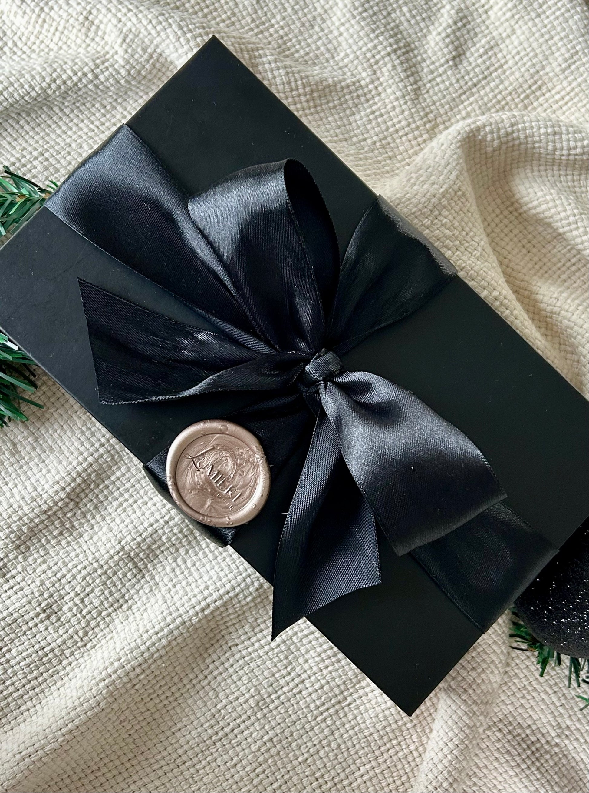 Twee handgemaakte kaarsen, zorgvuldig verpakt in een elegante geschenkdoos met zwart satijnen lint — klaar om als cadeau te geven (of om jezelf mee te verwennen).